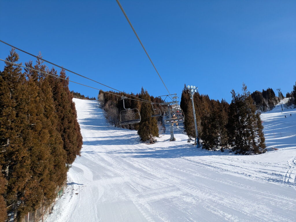 ゴンドラが運転開始されるまで、クワッドリフトに乗って肩慣らし。